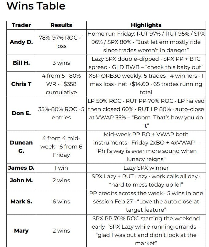 Fifteen traders. Twenty-nine screenshots. Home run Fridays, lifestyle trades from the school run and the errand queue, a first RUT premium trade going through its paces live with the group, and a man who closed a swing while he was driving and didn’t find out until he stopped.