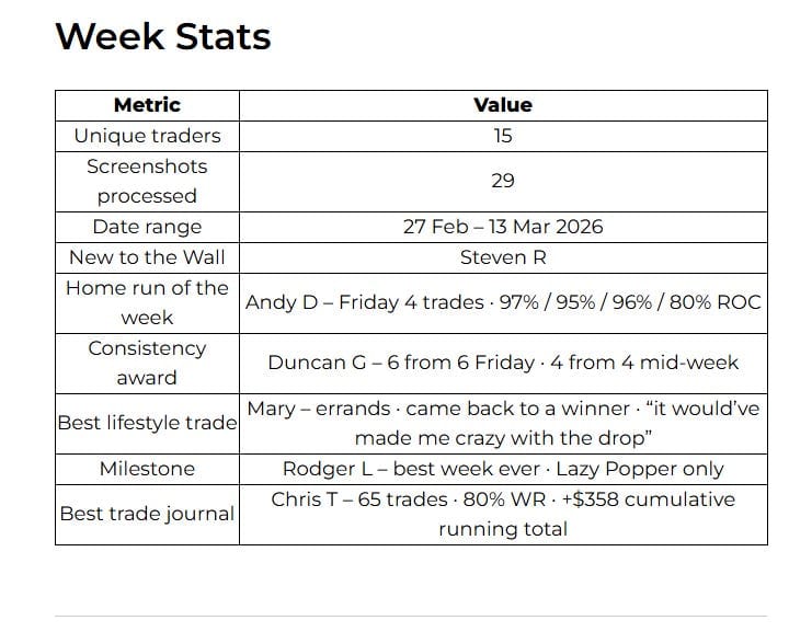 Date range: Week ending Friday 13 Mar 2026. 15 unique traders. 29 screenshots. Strategies across the board: Premium Poppers, Lazy Poppers, ORB30, Tag ‘n Turn swings, and one Gold BWB for good measure.