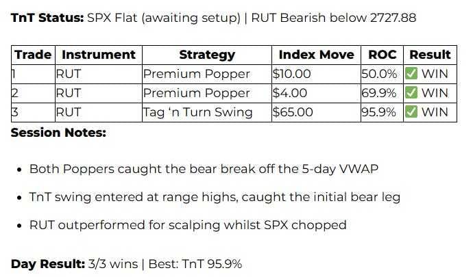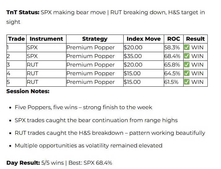 Average ROC (winners): 67.2% Best Trade: SPX TnT + BnB – 90% ROC ($90 index move) Only Loss: RUT Premium Popper – 95.5% loss (Tuesday)