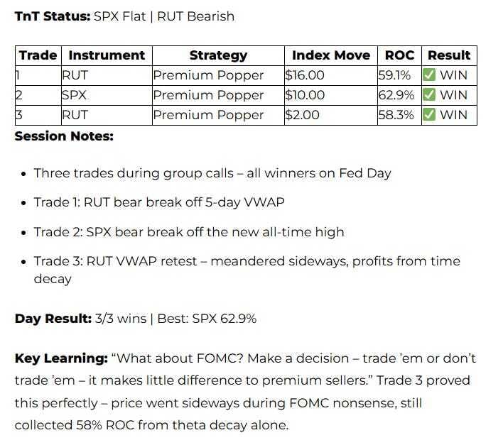 Wednesday brought Fed Day. The market held its breath for Powell. We collected three wins during FOMC because premium sellers don’t care about press conferences – we care about theta decay and elevated IV crushing post-announcement.