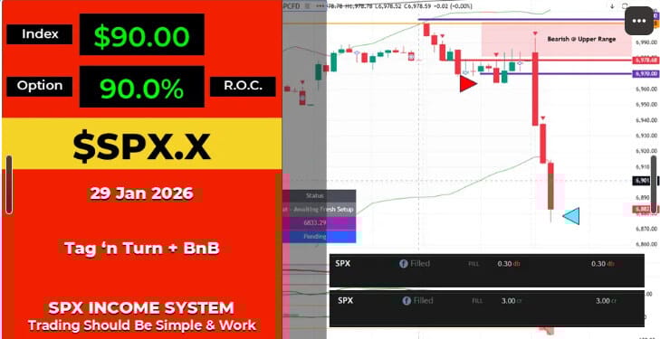 SPX TnT + BnB Overnight Swing: $90 index move. 90% ROC. The bearish setup we discussed – V-shaped entry at range highs – delivered beautifully.