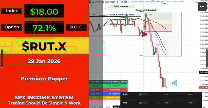 RUT Premium Popper #1: $18 index move. 68.98% ROC. Range high breakdown.