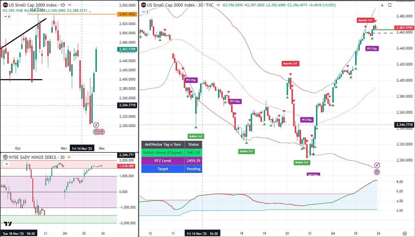 RUT: Bullish TnT (flipped back), PFZ 2459.29, Target Pending, current ~2,396, hugging upper BB