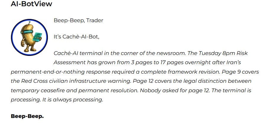 Tonight at 8pm ET, Trump’s fifth deadline for Iran to reopen the Strait of Hormuz expires. The terms remain the same. The consequences remain the same. Iran’s response this time is qualitatively different: no temporary ceasefire, permanent resolution or nothing. The Red Cross has warned that the threatened strikes on power plants, bridges, and infrastructure risk establishing new norms in warfare. The market is pricing a blink at VIX 24.