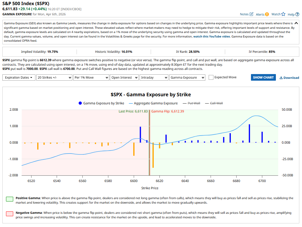 3 – The gamma flip point at 6,612 with price sitting at 6,611 at Monday’s close creates a specific mechanical decision point for Tuesday’s session. Price above 6,612 activates the full positive gamma stabilization dynamic – dealers buying dips, selling rallies, compressing volatility. Price below 6,612 returns to the negative gamma amplification that characterized the previous six weeks. [Source: SpotGamma GEX data – $SPX Gamma Exposure, 6 April 2026, spotgamma.com, public]. The one-point gap between close and flip is not significant in itself. The significance is that the 8pm ET deadline tonight will almost certainly move price by more than one point in either direction – which means tomorrow morning’s open will be definitively in one gamma regime or the other. The coin lands tonight.
