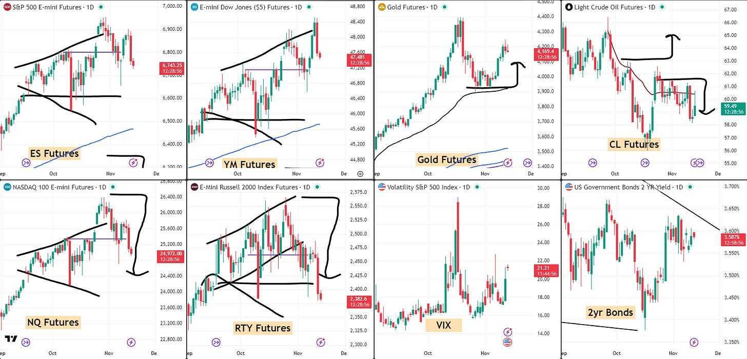 Uncle Russ leading bear charge all along (range low target approaching, full corrective move question), Mag7/AI/quantum bubble lost mojo, government back like Voldemort plot contradicting himself,