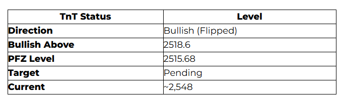 The Tag n Turn flipped bullish above 2518.6, with PFZ at 2515.68. Target pending.