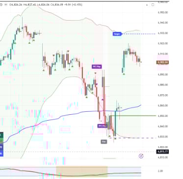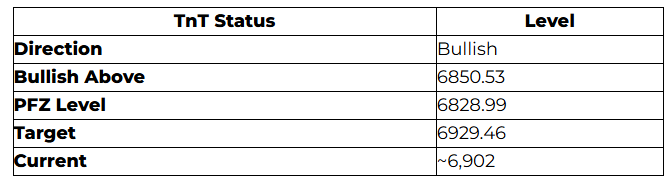 Currently bullish above 6850.53, targeting 6929.46. PFZ level sits at 6828.99.