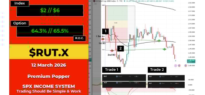 SPX ran 4 trades (64.3% / 65.5% / -93.5% / 90.0% ROC). RUT ran 2 trades (64.3% / 65.5% ROC). The penny that stopped T3 and the lazy day trade that paid 90% right behind it – all in there with the full week context.