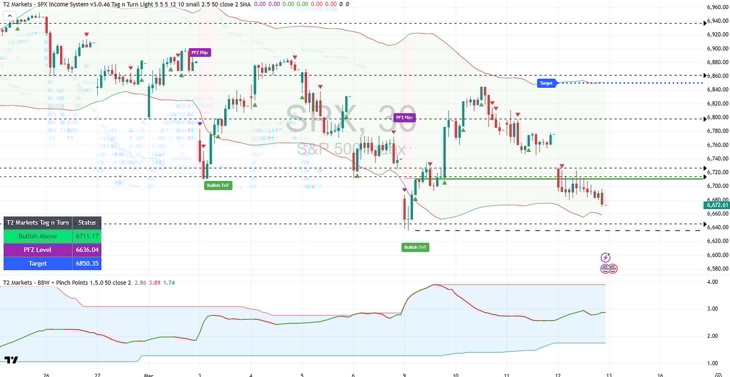 Current Status: SPX Bearish Below 6,796.09 / PFZ 6,845.08 / Target 6,726.76 / ATR 81.92 — RUT Bearish Below 2,553.55 / PFZ 2,591.33 / Target 2,509.57