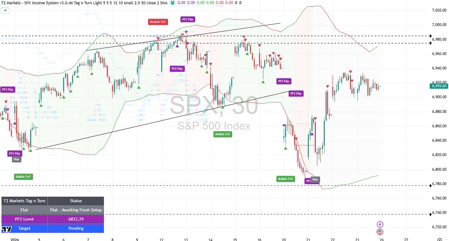 This week, we wait for the fresh setup. PFZ level at 6833.29 gives us our line in the sand. Until the system generates a clear signal, flat is the position.
