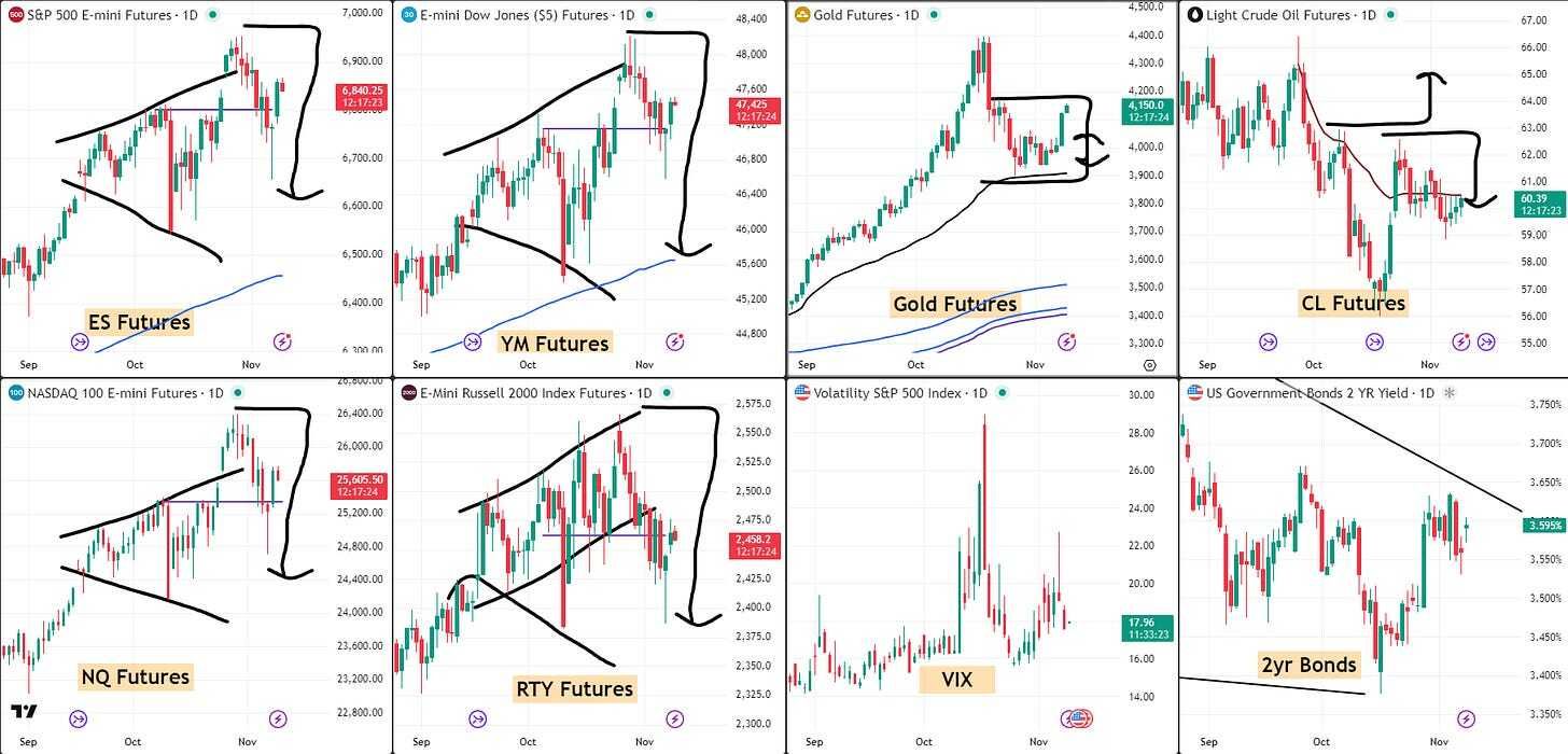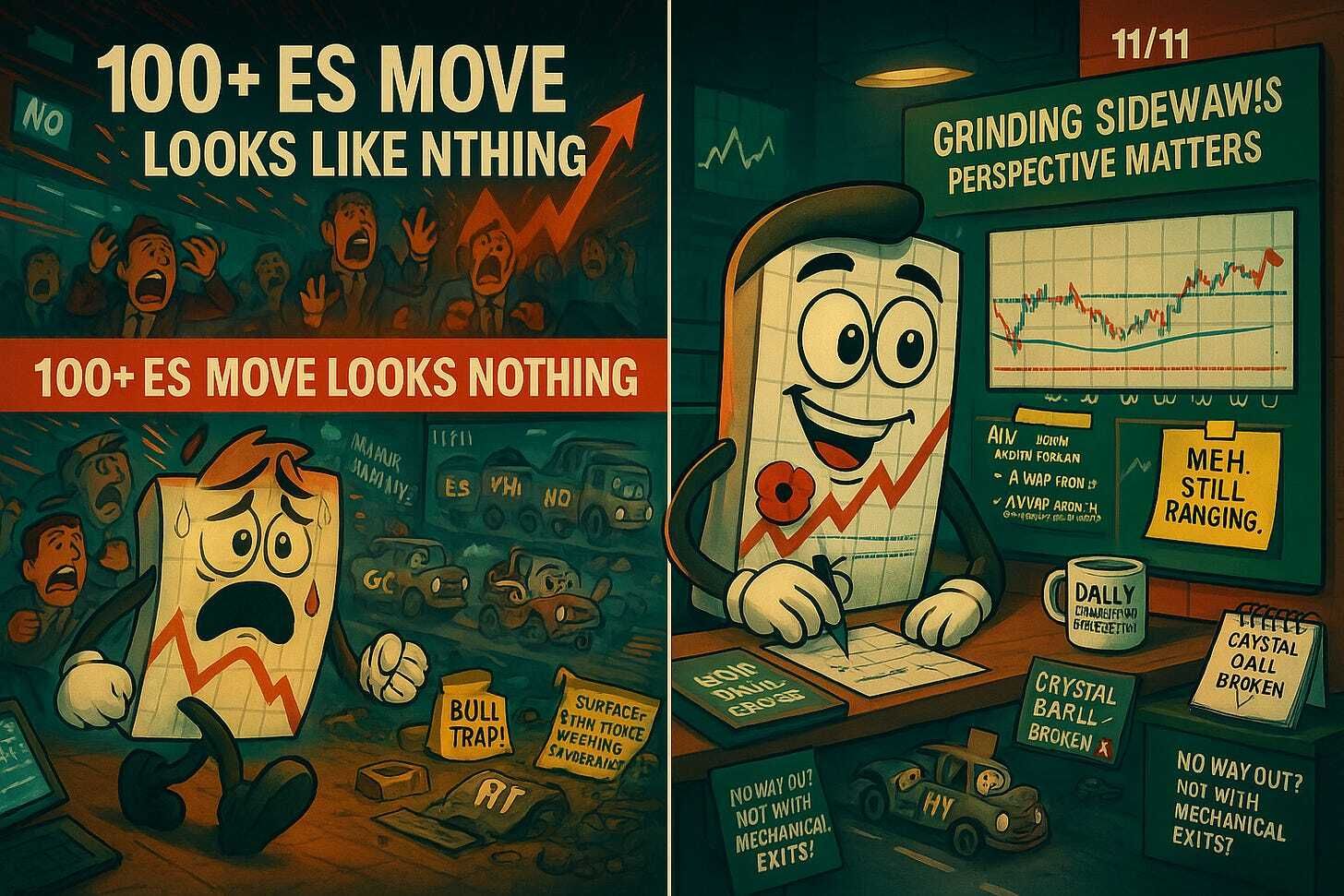 Tuesday November observes Remembrance Day honoring the fallen whilst markets grind sideways (no new ground won/lost despite yesterday’s 100+ ES move looking uneventful on daily charts), RTY wobble offering clues to real moves behind blue chip exuberance as gold leads reclaim with bull trap talk emerging, Phil responding to system not forecasts using firm over/under lines and AVWAP from TnT levels for management rather than waiting for PFZ trips.