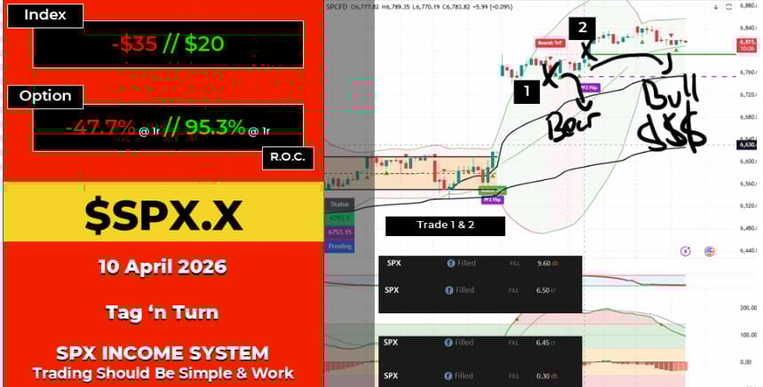 SPX Tag n Turn: Bear-to-bull flip sequence. The bear entry lost — which was the caution call from the research — and the bull reversal confirmed the 95%+ success rate the new scoring system had identified.
