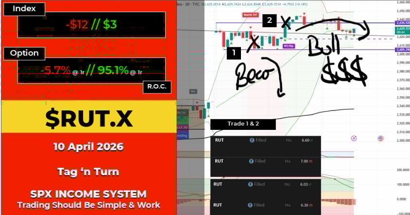 As for Friday’s trades – the Premium Poppers played out nicely with the new scoring system. Friday was a top tier day. The morning dragged its feet but the potential for a good setup remained, and then just prior to the cut-off point the software pinged: now. Two back-to-back setups, reasonably speedy result, little headache, 2x risk. The Tag n Turn also delivered on both SPX and RUT with the bear-to-bull flip sequence.
