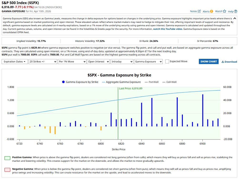 Still positive gamma. Flip point 6,629. Put and call walls both at 7,000. IV 15.77% still below historic vol 17.32%. IV Percentile 67%. Positive gamma environment intact despite blockade news.