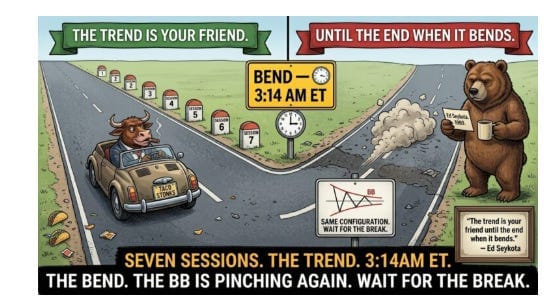 The BB Pinch – Again Same configuration as last week. Both 30-minute charts pinching. MACD-v extremes exited. The research says wait for the break. Last week the break resolved upward. This week the gap down is the first move. Pop lower before the next leg is the live scenario. Same process applies: wait for the confirmed signal, not the gap noise.