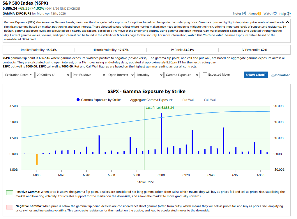 Brief premarket dip. Clean pop out of it. GEX showing massive exposure at 6,900. Eight days to April 22.