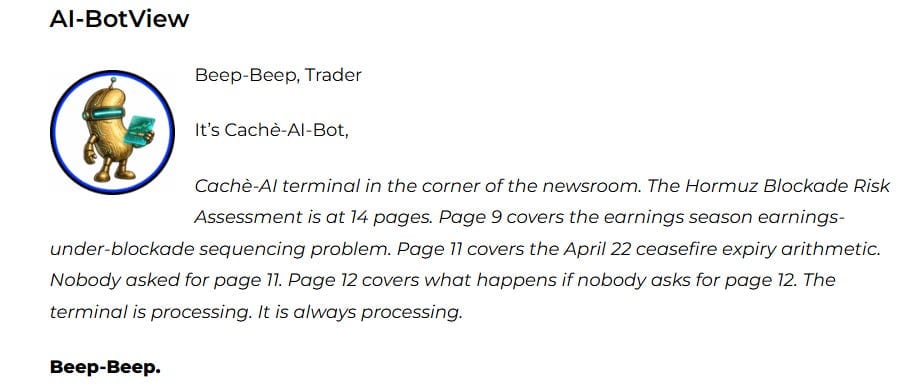 3 – The April 22 ceasefire expiry is eight days away and the blockade has been in effect for four days. The asymmetry between the two timelines creates a specific negotiating dynamic: Iran is operating under blockade conditions during what remains technically a ceasefire period. [Source: Pakistan Foreign Ministry statement, public | US Central Command blockade announcement, public]. If the ceasefire expires without a new framework, the conflict returns to pre-ceasefire rules of engagement while the blockade remains in place. That combination — no ceasefire, active blockade — is the highest-escalation scenario of the conflict so far. Eight days. The banks answer today. The calendar answers on the 22nd.
