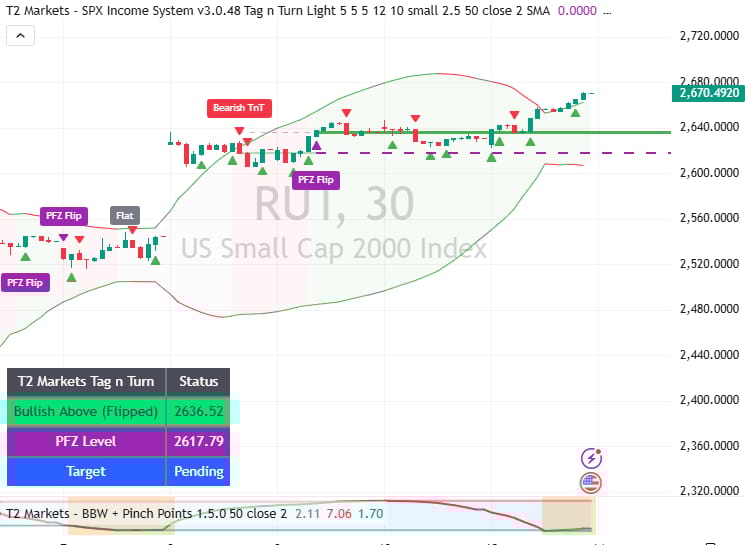 RUT mirrors the SPX picture — the brief premarket dip on Monday gave way to a clean break higher as the session established. The MACD-v has turned bullish again on the 30-minute chart. Both instruments are aligned, both broke out of their respective ranges, both are pointing toward the GEX magnets above. The bullish read is intact.