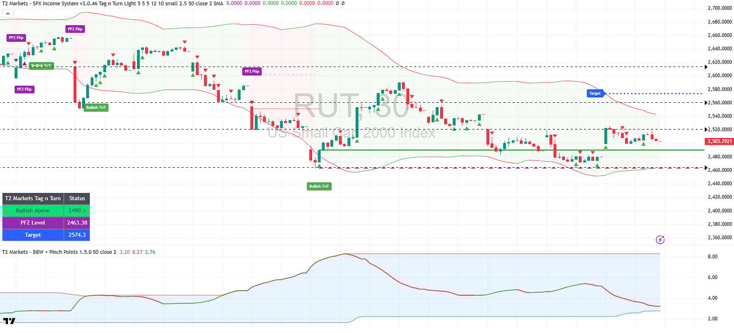 The new Bearish TnT is in place at 2,508.15. What’s notable is that RUT bypassed the potential bullish read completely and went straight to a new bear setup – that tells you something about the conviction in the downward move. The declining VWAP is holding nicely as a ceiling here too. Target 2,462.87 remains the downside objective.