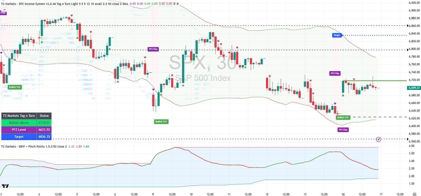 The Bearish TnT remains in place. Price continues below the 6,796.09 trigger. The declining VWAP is holding firm as resistance and it lines up precisely with the 6,700 GEX level – two independent reads pointing at the same ceiling. Until price can get and hold above that zone with conviction the bear case stays intact.