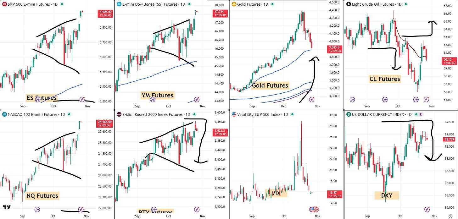 Think about it: SPX grinding to new highs on Fed optimism and trade deal hopes. RUT showing expanding triangle weakness and lower price action. Classic internal divergence suggesting the rally lacks broad participation.
