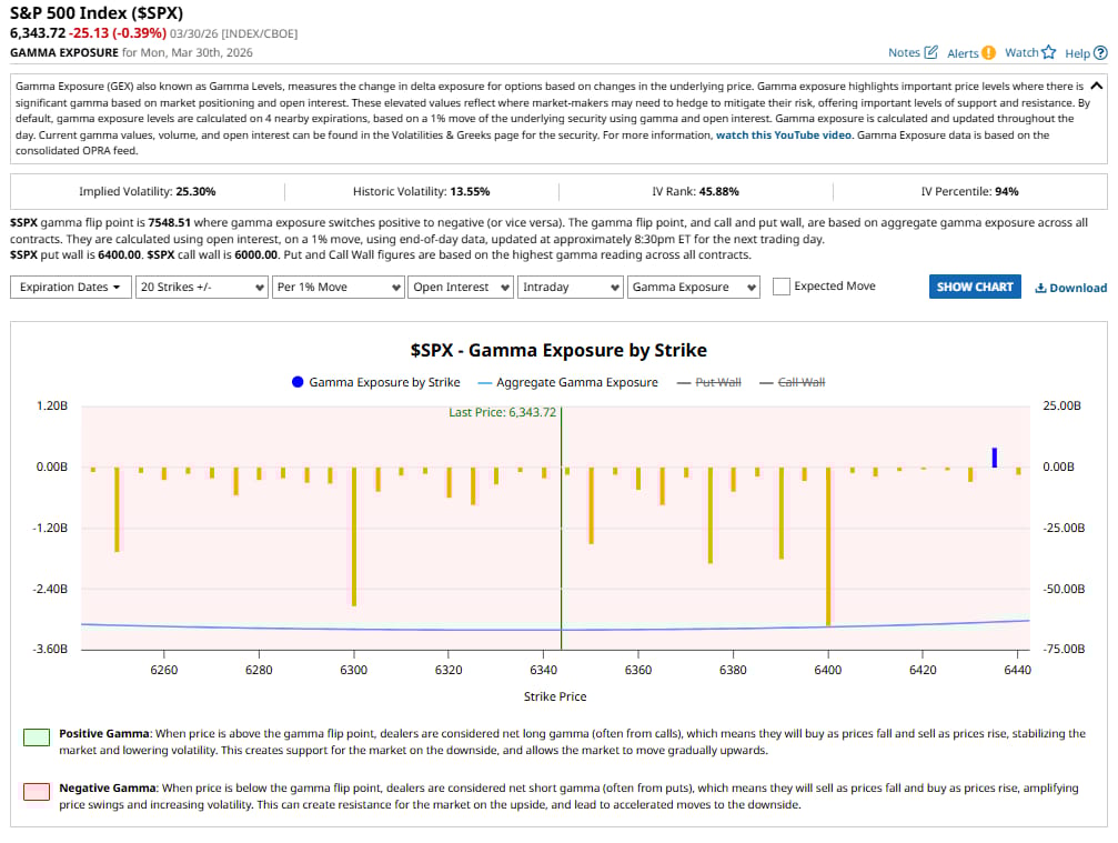 Current Status: Aggregate GEX -3.60B / flip point 7,548 / put wall 6,400 / call wall 6,000 / IV Percentile 94% / one positive spike — will not survive the open
