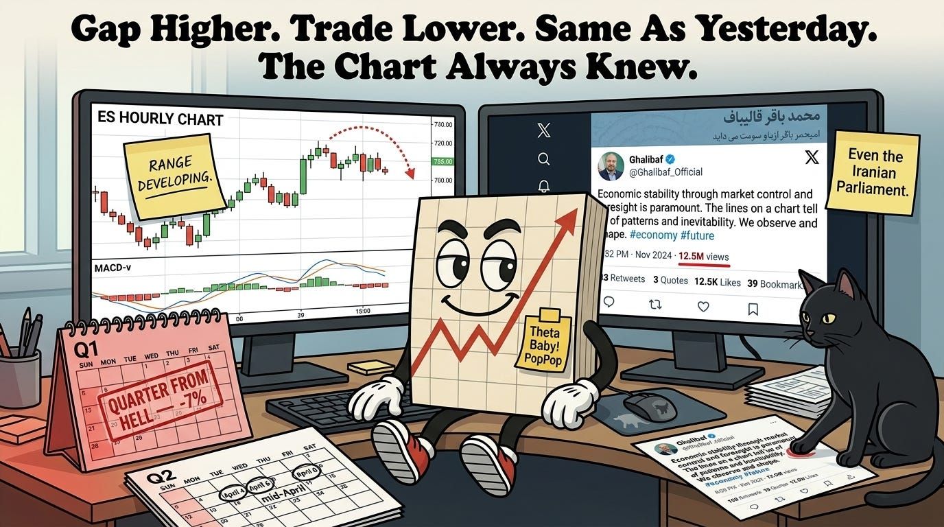 The Iranian Parliament Speaker is posting reverse indicator theory at 1:42am. The WSJ drops a de-escalation headline. Futures surge 1.1%. The instinct is to follow the narrative. The Darvas discipline is to follow the price action — and be fully prepared to change your mind when new information arrives. “Fully prepared to change my mind with new information” is the correct framing for today’s session. The gap higher is the new information. The negative gamma, the elevated VIX, and the lack of a TnT signal change are the price action response. Until the price action confirms the narrative, the range-developing bearish read stays.