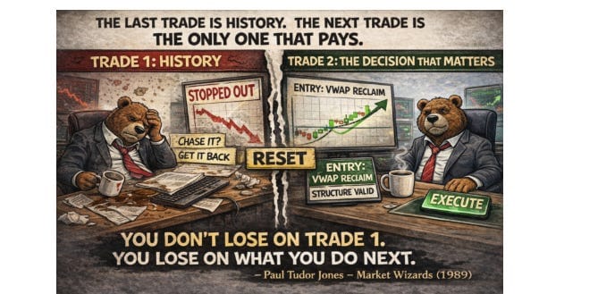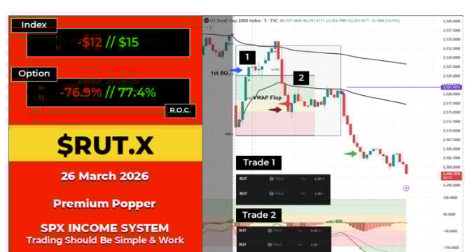 The 1st BO crapped out. The RUT went from almost touching target to full loss in a handful of candles. The natural response is to chase it, fight it, go full tilt. The correct response is a cup of tea, a rub of the ear lobes, and a reset. PTJ’s philosophy in practice: the first trade is history. What matters is the next one. The VWAP Flop, the 3rd BO, and the retest that followed were each their own decision – made from a clean slate, not from the emotional aftermath of the stop. That is the process holding under pressure.