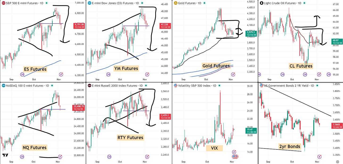 Wednesday November delivers weird and funky market top behavior as bearish breakout remains active despite knee-knocking whipsaws, Uncle Russell leads bear charge with ES close second, YM finding support at 47,200, NQ back inside containment, whilst Mag7 leaders tip over (META bear 600% ROC, AMZN abandoned baby pattern, NVDA chart-gasm setup) and Premium/Lazy Poppers tick over mechanically without buggering around.