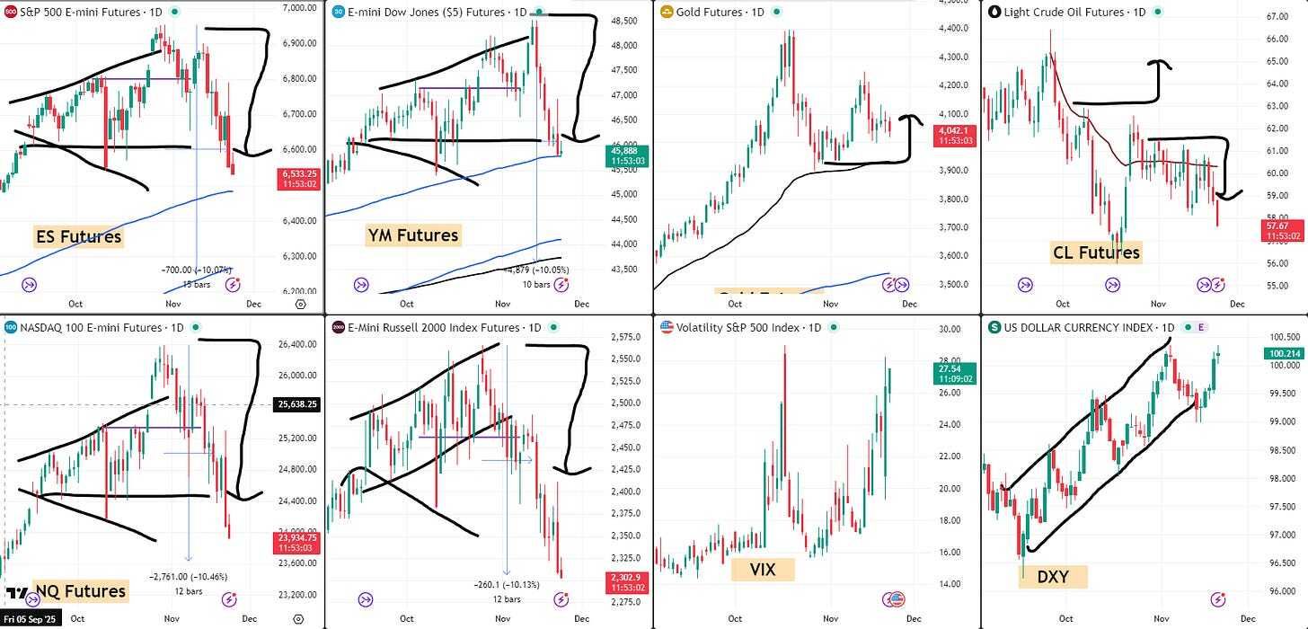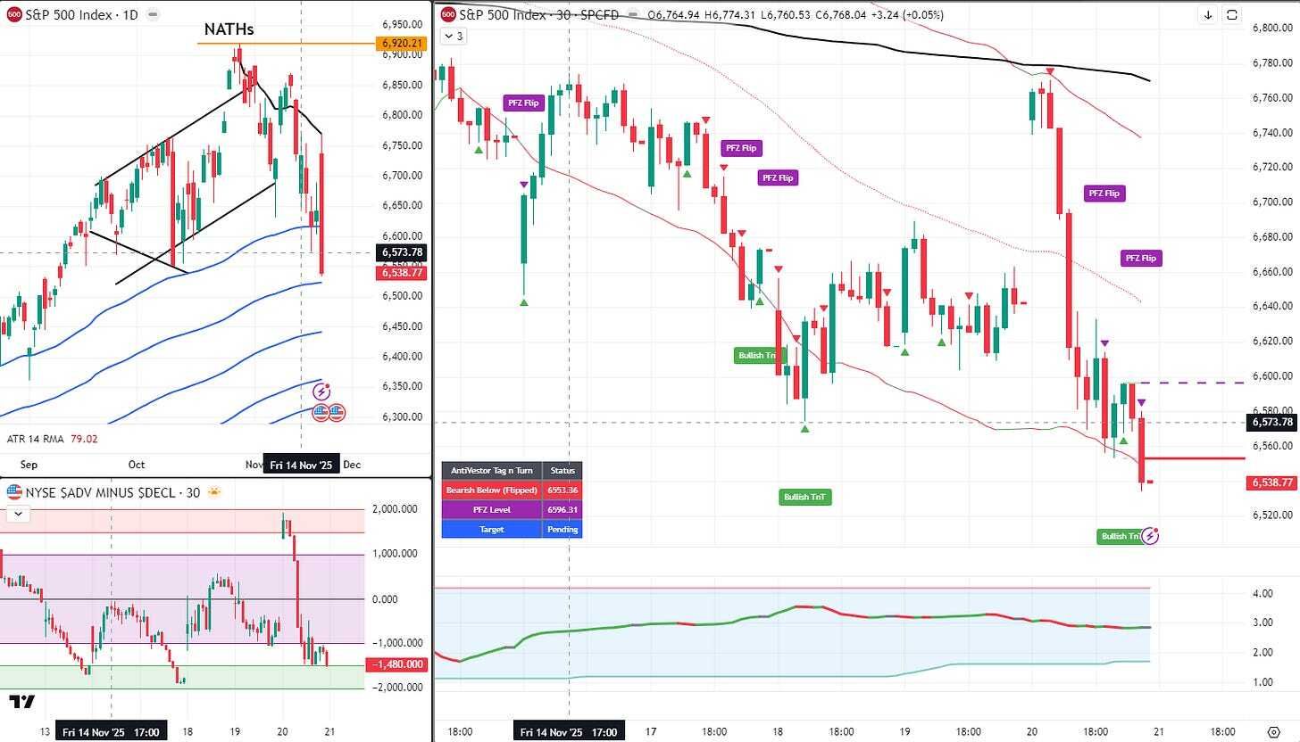 SPX Bulls bull’ed tagged turned bear’ed whilst NVDA briefly one-stock-to-rule-them-all before cast into fires of Mordor (headlines rejecting $500B reality embracing AI bubble narrative with 119K jobs killing December cut hope, Walmart soaring tech collapsing, Bitcoin crashing below $87K creating holders dreams melting whilst dip buying opportunity sets up),